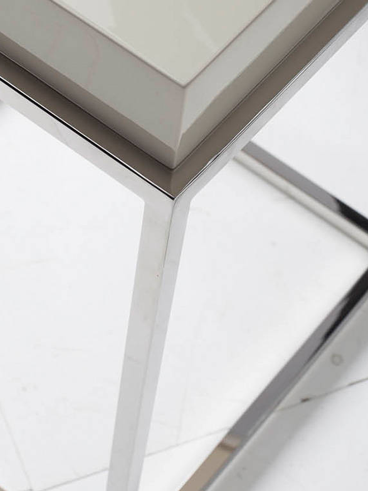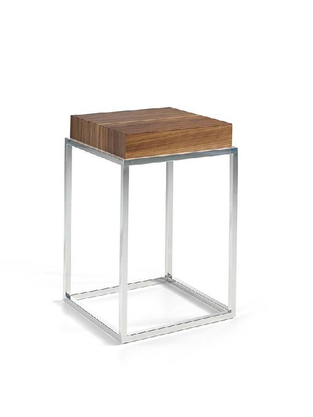 Este mueble tiene una estructura de acero inoxidable y una tapa enchapada en nogal o lacada.